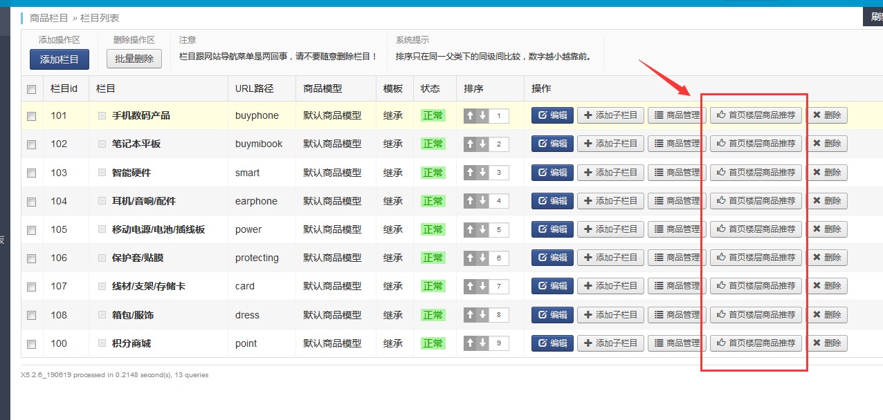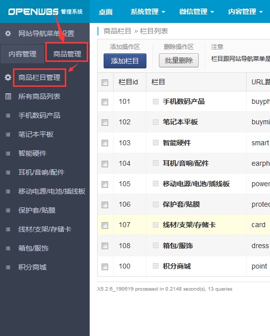 首先進(jìn)入后臺,左側(cè)管理面板:商品管理>商品欄目管理,進(jìn)入商品欄目管理頁面。
